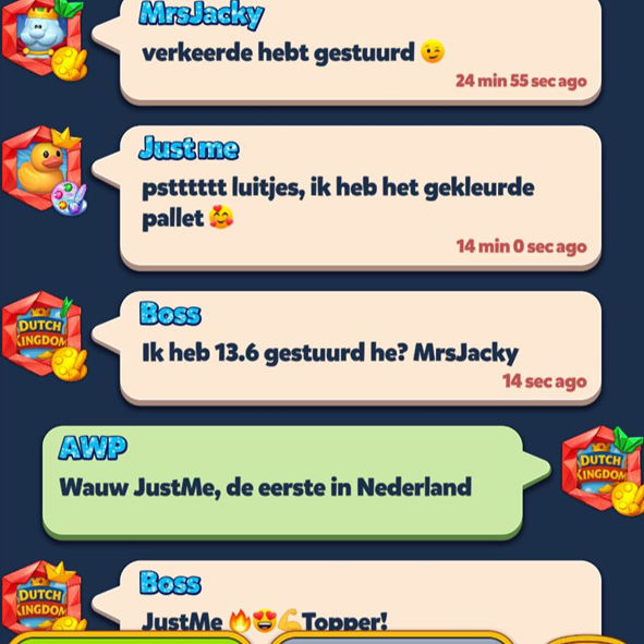Als trouwe Royal Match speler ben ik op de 1ste dag al een kijkje wezen nemen bij het toen oh zo nieuwe spel, Royal Kingdom en ben z.g.a. niet meer teruggekeerd naar Royal Match. Daar waar AWP direct zn eigen groep oprichtte met nog maar een paar spelers zijn we uitgegroeid tot dit waanzinnige leuke, grote fanatieke team. Bedankt voor jullie gezelligheid.