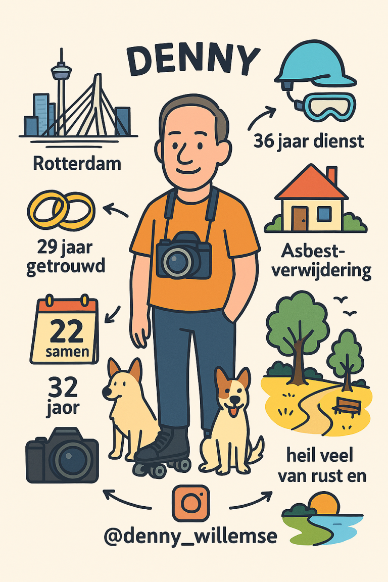 Ik denny geboren Rotterdammert woont al wat jaartjes in Spijkenisse ben 54 geboren 22 maart 1971 ben al 32 jaar samen waarvan 29 getrouwd werkzaam al 36 jaar bij het zelfde bedrijf momenteel begeleid ik de asbestverwijdering afdeling mijn hobbies fotografie ( zoek me maar op Instagram onder denny_willemse ) gek op rollerskate en mijn 2 honden hou heel veel van rust en natuur